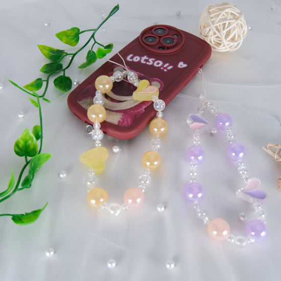 At the heart of this phone charm are intricately arranged beads, forming delicate petal-like patterns in vibrant, playful colors. Each bead is carefully selected to create a whimsical and eye-catching look, bringing joy and admiration to anyone who sees it.